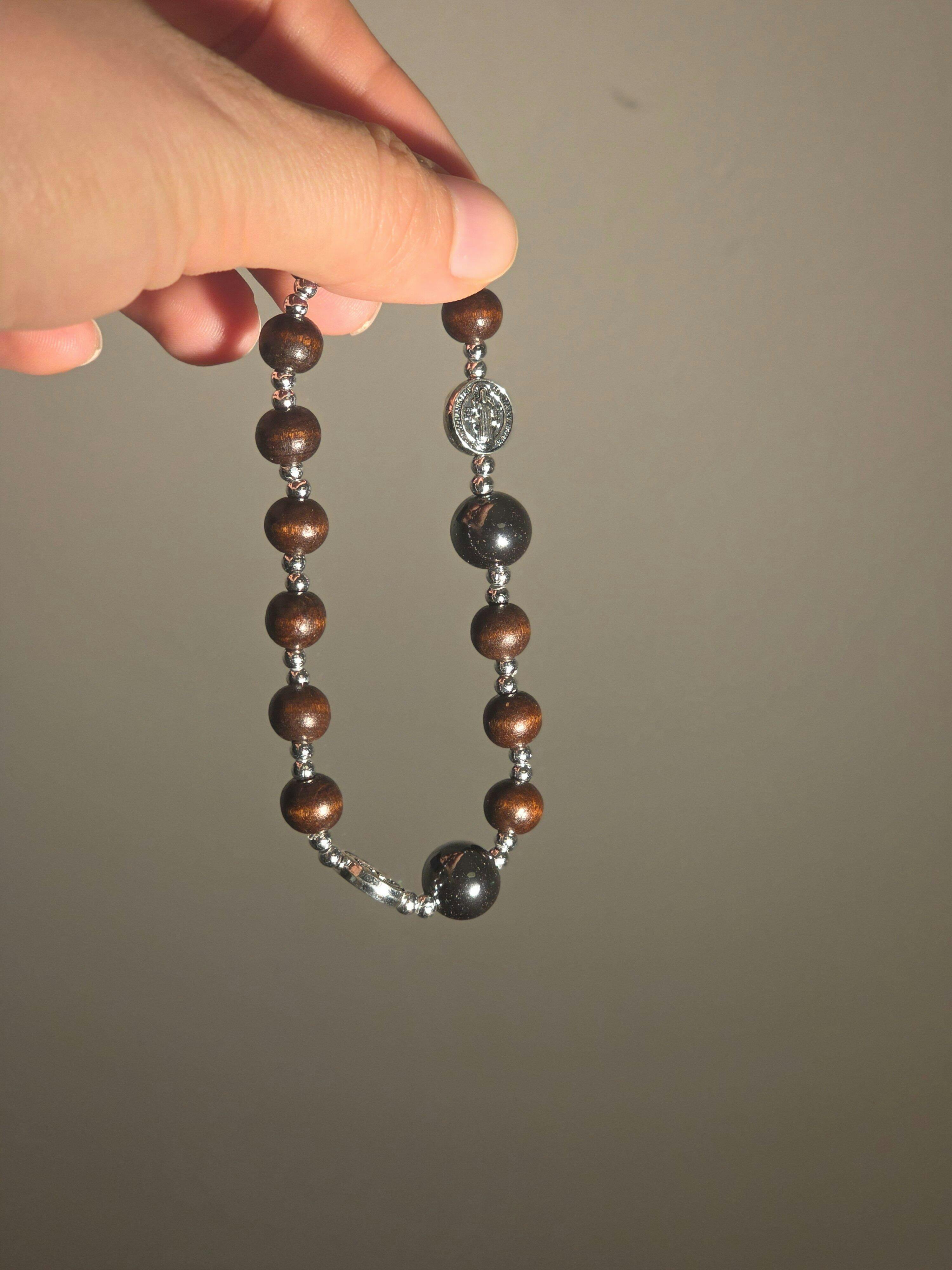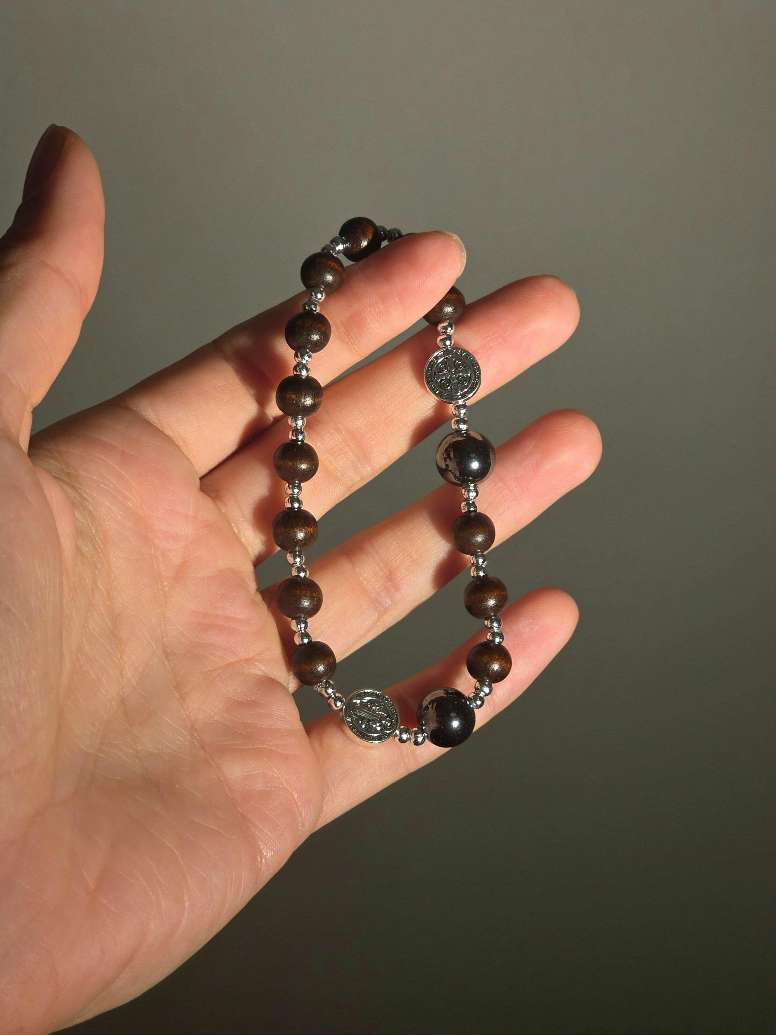 • Features dark brown wooden beads, hematite, and silver Saint Benedict medals